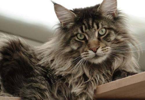 这是缅因猫,缅因猫因原产于美国缅因州而得名,是北美自然产生的第一个长毛猫品种,约于18世纪中叶形成较稳定品种。缅因猫体格强壮,被毛厚密,长像与西伯利亚森林猫相似,在猫类中亦属大体型的品种。