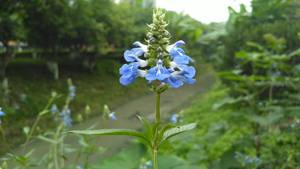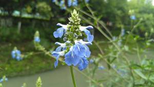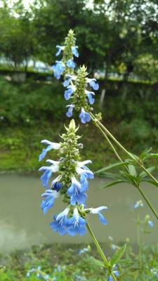 据悉,天蓝鼠尾草,又名沼生鼠尾草,它为唇形科多年生植物,总状花序细长,花瓣是漂亮的天蓝色,六至十朵成串轮生,香味不算特别浓郁,但很清新。最近时间,我就有多次看见这个天蓝鼠尾草,它们正开着湛蓝色的鲜花。如上次驱车路过荷花池,在一排街道的花台里,曾看见一片片的天蓝鼠尾草,它们正开着层层叠叠天蓝色的花,洋洋洒洒披生在高低不等的花茎头,惹来满眼清新爽朗的感觉。昨天又我去沙河公园,碰巧在河沟的一处堤旁,又发现三二丛天蓝鼠尾草,那些天蓝温馨的色彩,顿然间有了一种久违重逢的欣喜感觉。