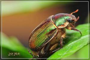 东方金龟(SericaorientalisMotsch),属鞘翅目,金龟科。主要危害苹果、山楂、梨、李、杏、樱桃等果树 。