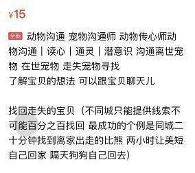 这种带有迷信色彩的服务曾经在寻宠圈火爆一时,直到现在都还有人上当受骗。小宠的一个朋友,暑期的时候丢了心爱的猫咪,搜寻20多天仍无果万般无奈下选择找“通灵师”帮忙。便在闲鱼上搜索到了相关的服务,通灵师声称可以和宠物沟通并算到宠物所在的位置,但需要宠物主先交钱再服务。