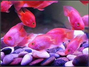 鹦鹉鱼在较暗的环境中体色容易变红,或者说是比较的容易显色,因此饲养鹦鹉鱼的鱼缸一般的都会选用深蓝色的背景纸,现在所谓的花花绿绿的背景纸早已经过时了。
