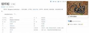 银环蛇(Bungarus multicinctus),俗称过基峡、白节黑、金钱白花蛇、银甲带、银包铁等。毒性极强,为陆地第四大毒蛇。