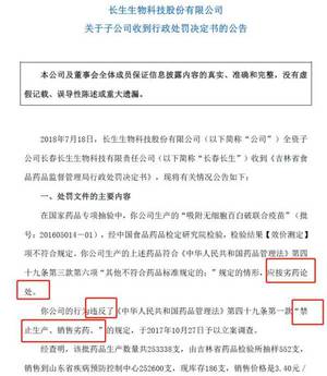 长生生物7月19日晚公告,全资子公司长春长生收到《吉林省食品药品监督管理局行政处罚决定书》,原因是该公司生产的百白破经食品药品检定研究院检验,检验结果“效价测定”项不符合规定。