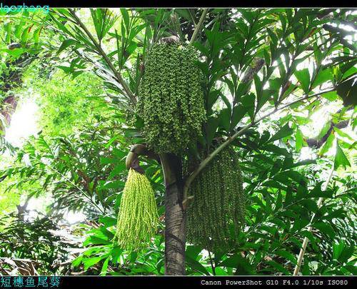 鱼尾葵 棕榈科、鱼尾葵属植物。乔木状,高10-15(-20)米,直径15-35厘米,茎绿色,被白色的毡状绒毛,具环状叶痕。茎干直立不分枝,叶大型,羽状二回羽状全裂,叶片厚,革质,大而粗壮,上部有不规则齿状缺刻,先端下垂,酷似鱼尾。花序最长的可达3米,花3朵簇生,花期7月,肉穗花序下垂,小花黄色。果球型,成熟后紫红色,果实、浆液与皮肤接触能导致皮肤瘙痒。