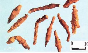 【药材特征】略呈纺锤形,稍弯曲,长1~100px,直径3~5mm。表面棕黄色至暗棕色,具多数半环状突起的环节,斜向交互排列,节上有鳞叶痕及点状突起的根痕。质坚脆,折断面颗粒状,类白色,粉性,有淡黄色维管束小点断续成环。气微,味微酸而麻舌。