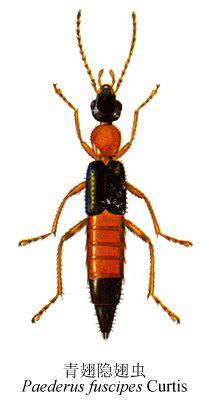 何为隐翅虫?隐翅虫是甲虫的一种,属昆虫纲,鞘翅目,隐翅虫科。其种类繁多,目前已发现250种以上。其中毒隐翅虫,如梭毒隐翅虫、青翅蚁隐翅虫、黑足蚁形隐翅虫有致病性。毒隐翅虫为黑色蚁状小飞虫,其体长0.6-0.8cm,头、翅和腹末呈黑色,而前胸、腹部及足为桔黄色,后翅长,膜质状,全身被覆短毛,落地后翅翼折起酷似大蚂蚁。此虫常栖居于潮湿的草地、稻田、菜园或腐木、乱石等阴暗处,昼伏夜出,有喜光(尤其对日光灯)及向高处飞行之习性,7-9月份为其大量繁殖的季节。该虫体内含有强酸(PH值1-2),一旦落到人身上而虫体被击碎,毒液外溢沾染皮肤,数小时内即可引起皮肤损害。