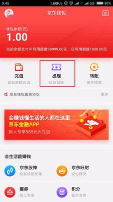1、京东钱包APP:打开钱包APP,点击【提现】操作