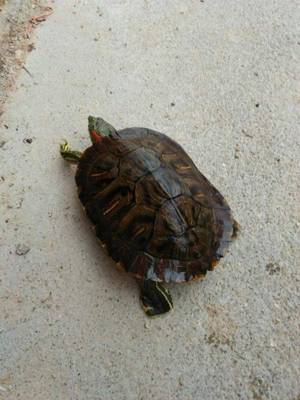 从照片看,这是巴西红耳龟。属于半水龟,进食必须在水中,同时还要有晒台供它晒太阳。