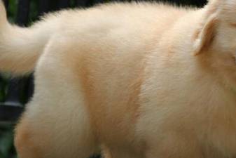2、皮毛:皮毛是金黄色或者乳黄色呈平直或者波浪状,尾巴和背部平行,长满边毛。毛量越多越好,可以用手抓上一把,如果感觉很舒适,松手后,毛发会恢复原状的,说明金毛的毛质很好。