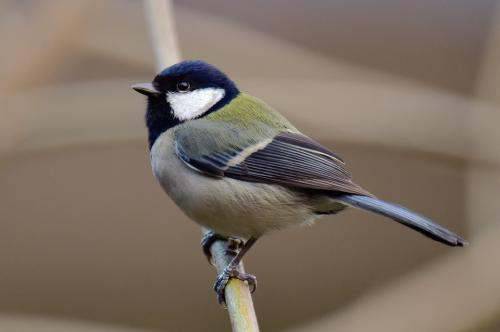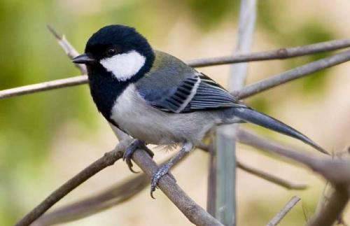 大山雀(学名:Parus major):中小型鸟类,体长13-15厘米。整个头呈黑色,头两侧各有一大型白斑,喙呈尖细状,便于捕食。上体为蓝灰色,背沾绿色。下体白色,胸、腹有一条宽阔的中央纵纹与颏、喉黑色相连。