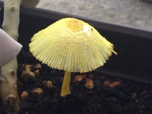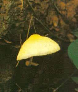 分类地位: 形态特征:子实体较小,柠檬黄色。菌盖直径2-5cm,初期呈钟形或斗笠形,后期稍平展,表面有一层柠檬黄色粉末,边缘具细长条棱。菌肉黄白色,薄,质脆。菌褶淡黄至白黄色,离生,不等长,稍密,边缘粗糙。菌柄细长,向下渐粗,长4-8cm,宽0.2-0.5cm,表面被一层柠檬黄色粉末,内部空心,质脆。菌环膜质,薄,生柄之上部,易脱落。孢子印白色。孢子光滑,近卵圆形,无色,9-10μm×5-8.5μm。褶缘囊体薄壁,近纺锤形,30-50μm×10.5-13μm。生态习性:夏秋季在林地、道旁、田野等地上散生或群生。