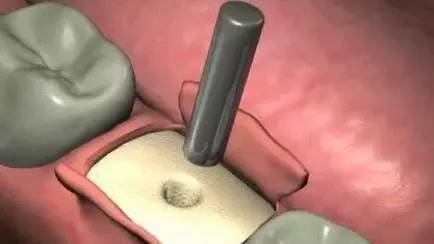 2、正式开始种植牙手术。在牙槽骨上制备一个孔,植入人工种植体。将牙骨床内严密缝合,大约一个星期后可以拆线。