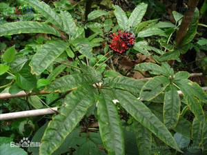 竹节参,多年生草本;主根肉质,圆柱形或纺锤形,淡黄色;根状茎很短,多较明显;茎高30-60厘米。掌状复叶3-6片轮生茎顶;小叶3-5,中央一片最大,椭圆形至长椭圆形,长8-12厘米,宽3-5厘米,先端长渐尖,基部楔形,下延,边缘有锯齿,上面脉上散生少数刚毛,下面无毛,最外一对侧生小叶较小;小叶柄长达2.5厘米。伞形花序单个顶生;花小,淡黄绿色;萼边缘有5齿;花瓣5;雄蕊5;子房下位,2室;花柱2,分离。果扁球形,成熟时鲜红色。 分布于东北;多栽培,很少野生,河北偶有栽培,据说云南试栽成功。肉质根是著名强壮滋补药,又为兴奋剂和祛痰药。