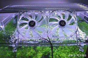 这种方式可能是大部分草友的选择,一般来说是用大号的CPU风扇接上变压器,架在鱼缸上对着水面吹,依靠水面的水份蒸发带走热量,达到降温的目的,实际效果能降低2度左右水温。降温风扇的价格也不贵,算是物美价廉,唯一的缺点可能是不是特别美观。