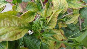 4,缺钙黄叶:辣椒缺钙,在植物矮化的原因,顶叶会有黄化,但下部叶片仍然是绿色,生长点和附近会停止生长或死亡,下部果实会变成棕色腐烂。