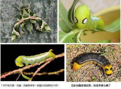 夹竹桃天蛾初龄体色绿色,腹端有一根黑色细长的尾突,终龄尾突橙色,胸背板上有一对框黑边的蓝白色拟眼大斑,各龄期体色多变,体型肥大,体侧有一条白色宽型纵纹,边缘具稀疏的白色斑点。