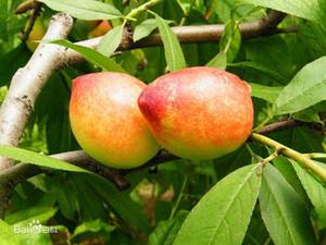 桃(学名:Amygdalus persicaL.):蔷薇科、桃属植物。落叶小乔木;叶为窄椭圆形至披针形,长15厘米,宽4厘米,先端成长而细的尖端,边缘有细齿,暗绿色有光泽,叶基具有蜜腺;树皮暗灰色,随年龄增长出现裂缝;花单生,从淡至深粉红或红色,有时为白色,有短柄,直径4厘米,早春开花;近球形核果,表面有毛茸,肉质可食,为橙黄色泛红色,直径7.5厘米,有带深麻点和沟纹的核,内含白色种子。