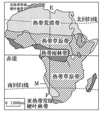 读图“非洲大陆自然带分布图”完成下列任务:(17分) (1)从图中可以看出,非洲自然带大体以 为对