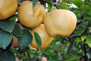 丰水梨:果实扁圆形,有2-3条缝合线,含糖量高达16%,多汁,口感极佳,成熟颜色为红褐色,套袋果金黄色,半透明状,成熟期为8月份。