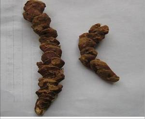 【药材特征】略呈纺锤形,稍弯曲,长1~100px,直径3~5mm。表面棕黄色至暗棕色,具多数半环状突起的环节,斜向交互排列,节上有鳞叶痕及点状突起的根痕。质坚脆,折断面颗粒状,类白色,粉性,有淡黄色维管束小点断续成环。气微,味微酸而麻舌。