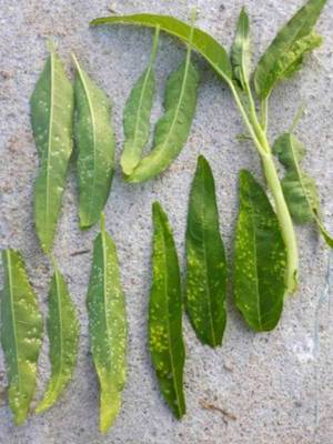 病斑在叶背面生,叶正面初现淡黄至黄色斑点,后渐变褐,病斑较大,叶背面生白色隆起状疱斑,近圆形或椭圆形至不规则形,有时愈合成较大的疱斑,后期疱斑破裂散出白色孢子囊,叶片受害严重时病斑密集,病叶畸形,叶片脱落。