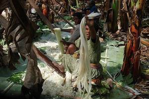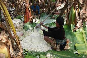 然后,非洲香蕉树的树纤维是非洲人们制作主食的原料。非洲香蕉树不结果,但它的根茎叶是非洲人们制作主食的材料。非洲人会把香蕉树砍倒,把香蕉树的根部去掉表皮,然后把里面的树纤维磨成粉末,然后用脚踩踏粉末并用香蕉叶包起来,然后埋进土里等它自行发酵一段时间,就会形成一个面团一样的东西。接着分成多个小团放在锅里面,像烙饼那样烤熟,然后配合上当地特制的酱料食用,这就是非洲当地的一种叫科科的食物。因为非洲生活条件太艰苦了,所以这种食物深受当地人民的喜爱,并且养活了上千万穷困潦倒的非洲人民。