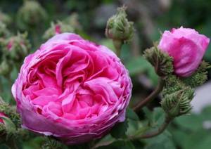 蔷薇:小枝有不等钩状皮刺,有时混有刺毛。小叶通常5,稀7,宽椭圆形或卵形,稀长圆卵形,长2-6厘米,边缘有单锯齿,下面被毛,托叶宽,半边有锯齿。花排列成伞房状,花梗有腺毛,花直径6-8厘米。