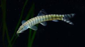 体长形,略圆,尾部侧扁。头长而尖。吻部甚长·尖端突出。眼小,侧上位.眼在吻端与鳃盖后缘的正中。侧线完全。背鳍无硬刺,起点位于腹鳍之前。尾鳍分又。体呈黄褐色,腹部灰白色,由鳃盖后缘至尾鳍基部南13~15条深褐包背腹向的横斑纹,尾鳍基部有一深褐色斑点。背鳍、尾鳍只有多行褐色斑点组成的纵纹。胸鳍、腹鳍、臀鳍与腹部色泽相同。