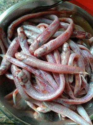 体似鳗形,稍侧扁。出头部无鳞外身披小圆鳞,无侧线。体红褐色或紫红色,各鳍颜色相似。用热油起锅加姜、辣椒煸香加入此鱼、调料、酱油、水 炖煮。