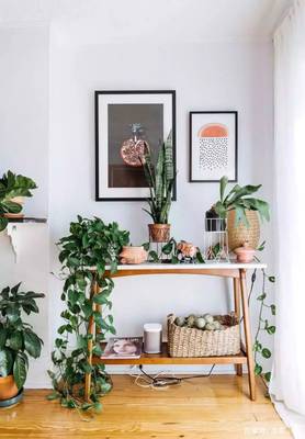 还有这样的花架,呈梯形向上,很有层次感。或者是这样简单的架子,靠墙放置,把植物摆放成高低的层次,搭配挂画,也是一幅岁月静好的画面。
