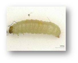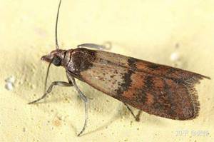 印度谷螟,属于鳞翅目斑螟科,成虫体长6—7mm,静止后翅收回体长9—10mm,前翅长三角形,亚基线与中横线之间为灰黄色,其余为赤褐色并散生有紫黑色斑点,后翅灰白色。