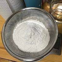 第五步,向玻璃碗中加入高筋面粉,干酵母。