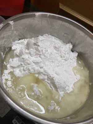 • 发好的米浆中加入生粉、糖、泡打粉、油