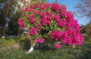 三角梅为藤状灌木或小乔木,常绿植物。茎粗壮,枝下垂,无毛或疏生柔毛;刺腋生,长5-15毫米。叶互生;有柄,叶片纸质,卵形或卵状披针形,花顶生枝端的3个苞片内,花梗与苞片中脉贴生,每个苞片上生一朵花;苞片3枚,叶状,紫色或洋红色,长圆形或椭圆形,长2.5-3.5厘米,宽约2厘米,纸质;花被管长约2厘米,淡绿色,疏生柔毛,有棱,顶端5浅裂;雄蕊6-8;花柱侧生,线形,边缘扩展成薄片状,柱头尖。