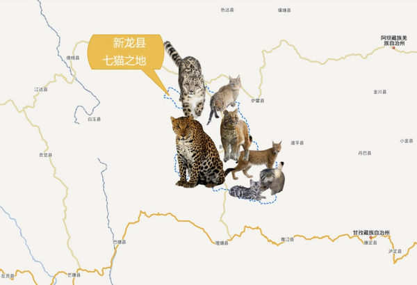 在了解了世界猫科动物分布格局之后,再来看看中国的猫科动物分布格局就容易理解多了。我国是一个地大物博的国家,动物资源丰富,近40种猫科动物中我国占据了13种,其中又以四川甘孜新龙县最多,目前已经发现的猫科动物高达7种,分别是雪豹、金钱豹、豹猫、欧亚猞猁、亚洲金猫、荒漠猫及兔狲,所以这里也被誉为“七猫之地”。