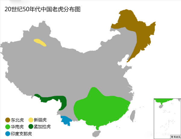 20世纪50年代中国老虎分布图