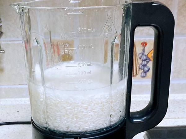 2、泡好的米放入破壁机加220克清水,按果蔬键打三遍,最后一遍的时候把白糖加进去一起打。