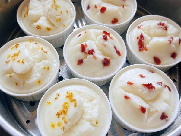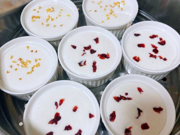 7、加入桂花,蔓越莓,葡萄干或者自己喜欢的果干都可以。水开后大火蒸20分钟(要想开花一定要水开再上锅大火蒸),然后闷3分钟就可以出锅了。