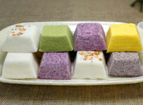 米糕是中国特色传统小吃食品之一。米糕是用黏性大的米或米粉来蒸成,加工制作方便,耐贮藏,食用方法多样。 原料配方 (1)甜米糕:糯米40、白糖或饴糖20、水40。 (2)萝卜米糕:晚籼米29、水30、白萝卜40、盐0.7、辣椒0.25、味精0.05。 (3)发酵米糕:晚籼米25、水30、水麦面粉25、红糖或饴糖19.3、膨松剂0.7。 制作工艺要点 (1)除杂清洗 选择精白糯米除去沙石等杂质,并用清水反复冲洗干净。 (2)浸泡 将洗好的米放在浸泡池中加清水浸泡12~24小时,待米粒发胀,含水率为35%~40%即可。 (3)磨粉 可将浸泡好的米倒入粉碎机料斗,开机把湿米磨成湿米粉。 (4)揉粉 揉米糕怎么做