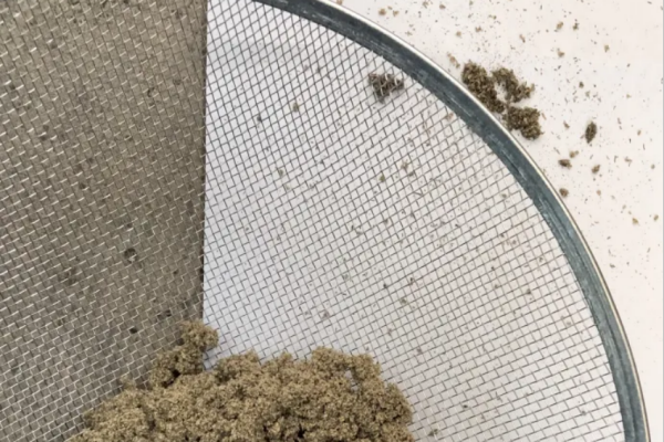 3、筛子过滤,逐渐把艾叶锤成团状,用筛子过滤去除硬杆杂质,剩余的就是艾绒。
