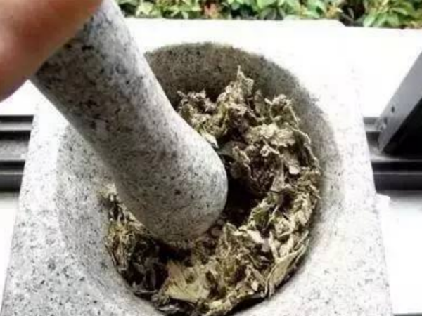 2、锤艾叶:将艾叶放入石臼中反复锤打,使艾叶叶柄分离。