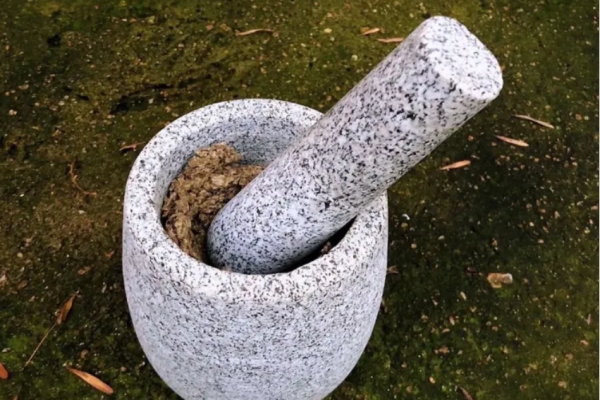3、将分拣后的艾叶放到石臼中,反复捣出后,边揉搓边反复分拣杂质,千锤百炼,先用粗石臼捣磨,筛检之后再用细石臼反复捣磨筛检,至少要捣3000下以上,方成可用于米粒灸的细绒。