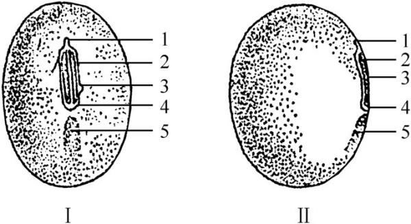 1.合点2.脐3.脐接处4.珠孔5.幼茎的透射处。