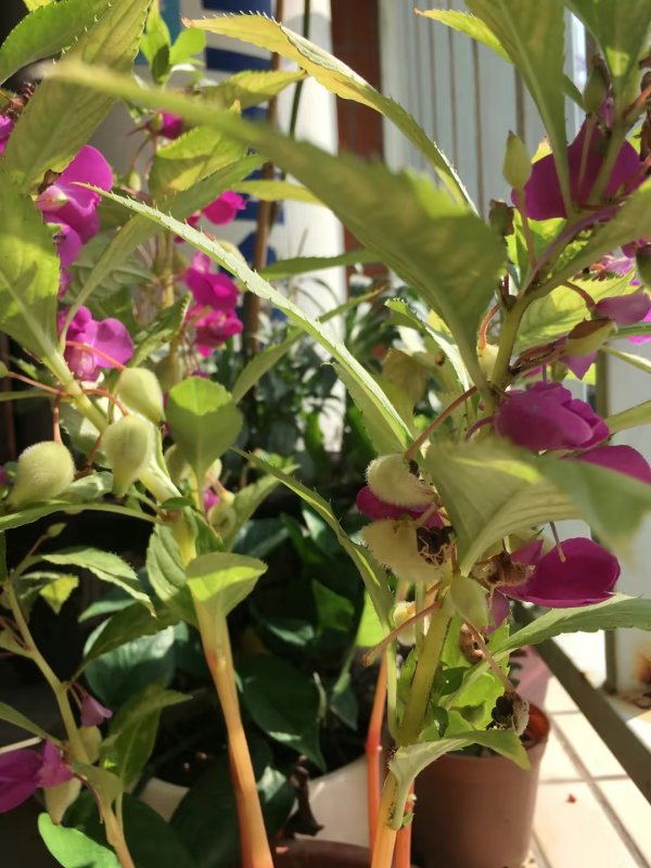 4、凤仙花有好几种颜色,常见的有大红的、粉红的、紫的、白的。我家小朋友种的这几棵是紫色花的。