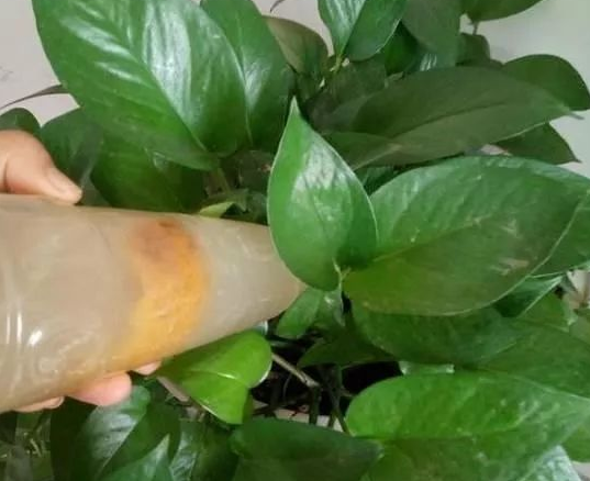 4、最后当气味闻起来有点微酸时,就算沤好啦!沤制完后按1:50的比例兑水稀释,就能直接拿来浇花了,每个月浇一次。用橘子皮肥水浇过的绿萝,叶子绿油油的,长得非常快,2~3个月就能长2米长!