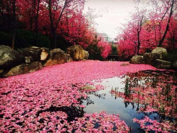 可大片栽植造成“花海”景观,可三五成丛点缀于绿地形成锦团,也可孤植,形成“万绿丛中一点红”之画意。樱花还可作小路行道树、绿篱或制作盆景。