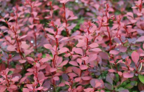 红叶小檗(学名:Berberis thunbergii var. atropurpurea Chenault),别名:紫叶小檗,小檗科、小檗属。原产于中国东北南部、华北及秦岭。多生于海拔1000米左右的林缘或疏林空地。落叶灌木,枝丛生,幼枝紫红色或暗红色,老枝灰棕色或紫褐色。叶小全缘,菱形或倒卵,紫红到鲜红,叶背色稍淡。4月开花,花黄色。果实椭圆形,果熟后艳红美丽。