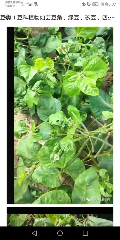重花叶子型:病叶呈黄绿相间的斑驳陆离,发皱比较严重,叶柄深褐色弯折,叶脉呈泡状凸起,深绿色。全部叶片的叶边向后卷曲,中后期叶柄萎缩,植物矮化砧。发皱花叶子型:病叶呈浅绿色两色的花叶子而发皱。叶片沿叶柄呈泡状凸起,叶边往下卷曲,常使叶片发皱呈歪扭的歪斜形。植物矮化砧,结荚少。 防治方式 取种抗病毒治疗种类:培养抗病品种是处理大豆病毒病的主要对策。现阶段营销推广的较抗病毒治疗病的种类有:东农42、黑农39、合丰34等。 创建没病留种地:留种地的种子理应严苛开展挑选,保证疾病下不来田,生长发育 时节要及时喷药防蛀。 清除田里野草:降低毒源,在烟草种植区,需注意香烟与大豆间烟草环 斑病毒感染的互相感柒。 防治传毒虫类:防治有翅蚜的迁徒,对病菌的长距离散播起较大效果。防 治蚜虫的具体方法见大豆蚜虫频道。 提升肥水管理:可缓解病发。