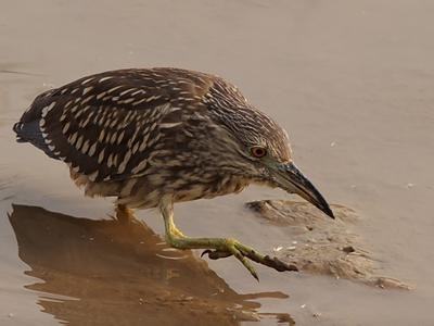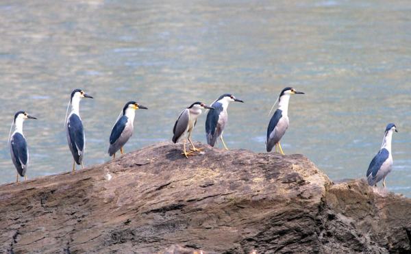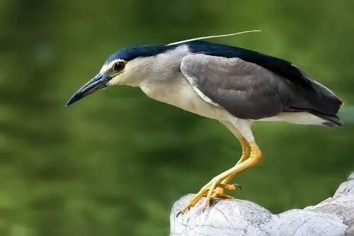 夜鹭(学名:Nycticorax nycticorax)是中型涉禽,体长46-60厘米。体较粗胖,颈较短;嘴尖细,微向下曲,黑色;胫裸出部分较少,脚和趾黄色;头顶至背黑绿色而具金属光泽;上体余部灰色;下体白色;枕部披有2-3枚长带状白色饰羽,下垂至背上,极为醒目。