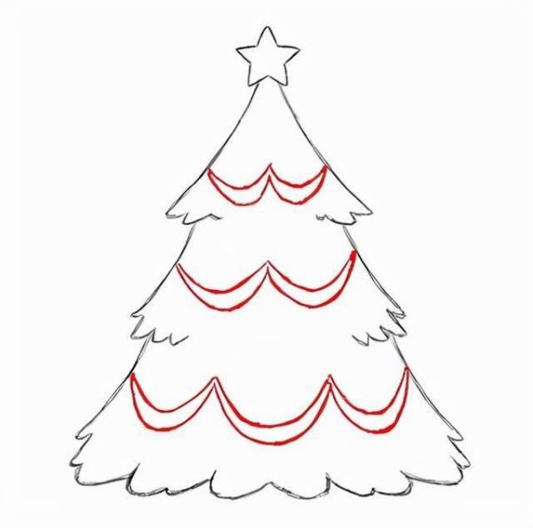 在星星下面,画两条弧线,一条向左倾斜,另外一条向右倾斜,线条的弧度大致相同。在底部添加一些穗状物来表示松针。用上面的方法继续往下画圣诞树的松针。同样的方法画最下面的一层松针。